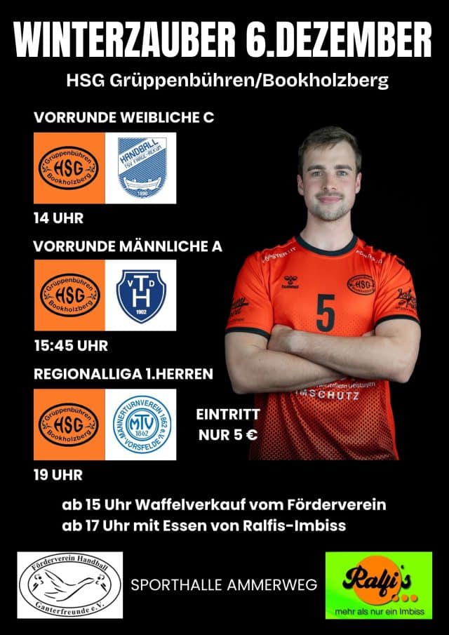 Zum letzten Heimspiel der 1.Herren im Jahr 2025 lädt der Förderverein wieder zum Winterzauber ein. Ab 15 Uhr gibt es einen Waffelverkauf und ab 17/17:30 Uhr steht dann auch wieder Ralfi’s Imbiss vor der Halle. Dazu gibt es leckere Getränke. Gemeinsam wollen wir auf ein erfolgreiches Jahr anstoßen.